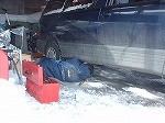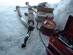 日曜日にピットkuninenのガレージで(kuninen宅(爆))で交換作業開始。当初は太鼓部分のつり下げゴムを外し、パイプのフランジネジ4本を外し、あっけなく交換完了となるはず・・・・でした。しかし・・・(爆) なんと車が古いため、ボルトのネジ山が腐食し工具をかけても回らず、数回メガネレンチをかけているとネジ頭が丸坊主に!(爆)困り果てたので修理工場の友人にTELすると、溶接されているナット側をバーナーで真っ赤になるまで熱し、坊主頭をバイスプライヤーでつかみ一気に回すと簡単に外れるとのこと。 早速、ホームセンターへ行きバーナーと予備のボルトナット、バイスプライヤーをGet。 で、言われた通りに挑戦するが、周囲は氷点下、しかも一般用の最高1300℃バーナー。加熱も弱く、バイスもかからず、再度中断。σ(^_^;)アセアセ... |