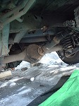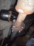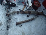 | 再〃度、作戦会議の結果、更にエンジン側に近い部分でマフラーを外す方法に変更。外す部品点数が増えるため、かなりの難作業。でも作戦成功で該当部分の着脱に大成功っす。 周囲は相変わらずの氷点下。何度か暖をとりながら作業は進みます(笑)。次は外したパイプ部分の丸坊主になったボルト4本を外す作業です。方法はネジ頭をグラインダー(サンダーとも呼ぶ)で切り離し、強引にボルト軸を叩き抜くという方法でした。<ホントなんでも工具のある家や(爆)。 |