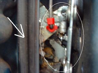 7,白丸で囲んだ部分が今回バラしたい場所ですが手前の矢印のドアガラスガイドが邪魔をしてますので、ドアの外側にあるネジをハズしガイドをハズします。ガイドの上の固定は差込になってるので、ネジを外すだけで簡単に外れます。丸印の部品は外側のネジ数本を外すと自由になります。 ☆ この時、ついでにガイドのゴムのガラスが通る部分にグリスを塗布しておくと、ガラスの上下動作がスムーズになります。 |
