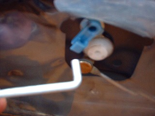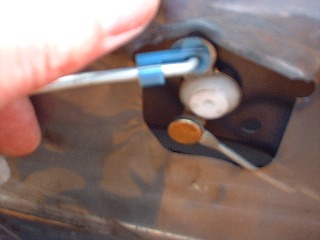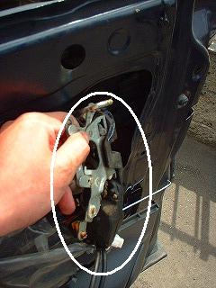 4,内張側とドア側がロッド2ヶ所(ロック用と開閉用)でつながってます。抜け防止樹脂製のロックで固定されているので写真の様にハズします。 |
