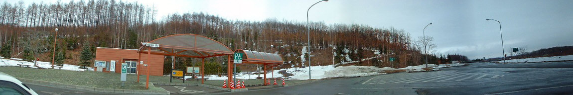 ![]() ここは日高方面から帯広方面へ向かう道東自動車道の十勝平原SAから帯広方面を左手に 眺めたパノラマ写真です。残雪が春遠しを物語ってますね。 |