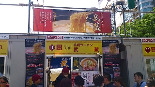 場所は札幌市のど真ん中、大通公園8丁目、ちょうど「ライラック祭り」が 開催中ですので、平日にもかかわらず、沢山の人達で溢れかえってました。 平日なんですけど、大通り公園周辺の駐車場はどこも満車! こんな事は初めてです(笑) ![]() 出店数は道内外合わせて12店 ![]() 手前は道外勢のお店!長蛇の列です! 奥は道内のお店!メッチャ寂しい行列です(^▽^;) 飲食スペースは座席数も豊富 混んではいますが座れます! ![]() 道外店の待ち時間は約1時間位でしょうか? 道内店でも20分位かな ![]() 僕達は道内店の「武蔵」行列の長さから選びました。 ![]() 意外だったのは名店「すみれ」は全く行列無し。閑古鳥が鳴いてました。