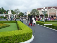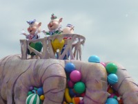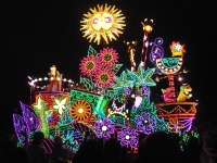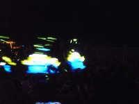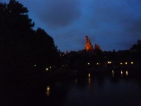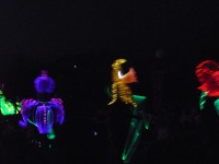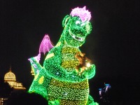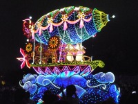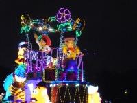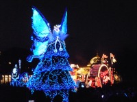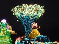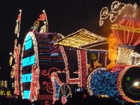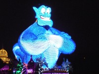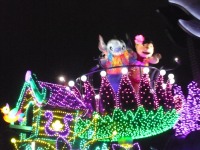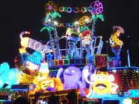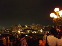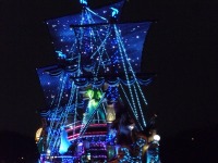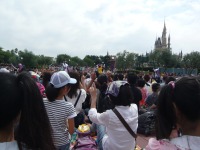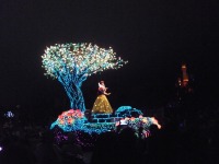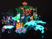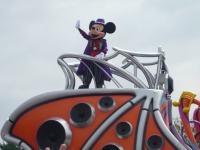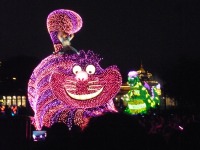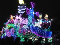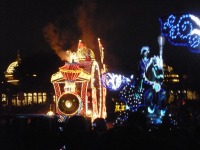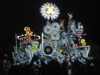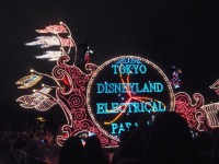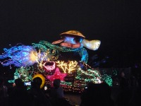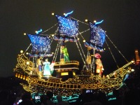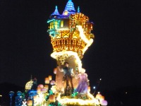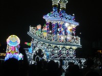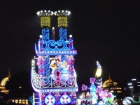 食事の後は夜のパレードまで、あれこれとアトラクションを楽しみながら時間つぶしです。パレードの時間が迫り場所取りに。だいたい昼と同じ場所を確保できました。しばらく待つと、お馴染みのBGMでパレードの開始です。メッチャ綺麗でした。