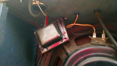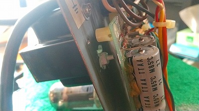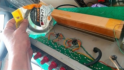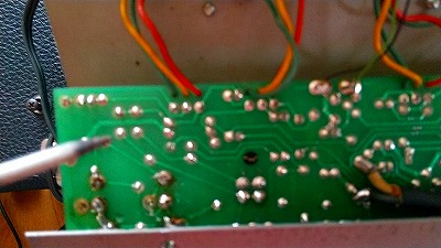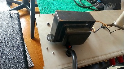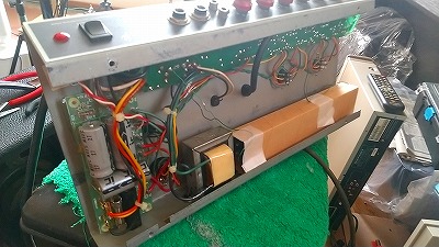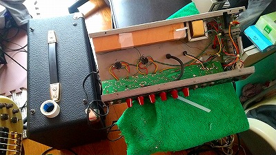 トランスの巻き線は異常なしと予想して、トランスの再固定。これで一度試運転しましたが改善なし。で、力のかかったかもしれない配線のハンダ部分と、基盤を絶縁棒で叩いて、変な音のするところや、入力系統のポットなどの基盤ハンダを再ハンダ打ち直し。あとはリバーブユニットも脱落していたので両面テープで再固定。