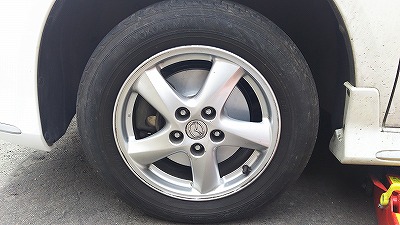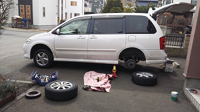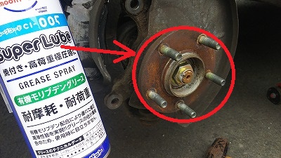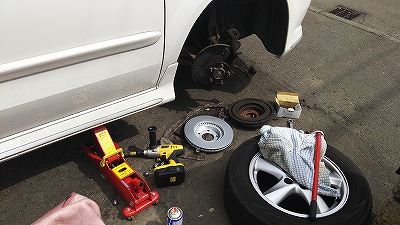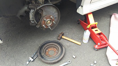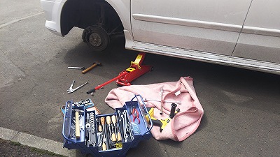 作業に必要な工具などはメガネレンチ2種類とハンマー、ソケットレンチ、通常のタイヤ交換の道具一式。モリブデン入りのスプレー。ボルト緩め用の潤滑スプレー。