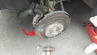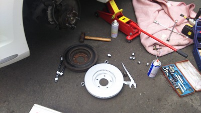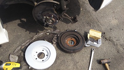 昨年暮れの車検見積もり時にABから指摘されていたフロントブレーキディスクローターの変形摩耗。冬期間にネットで探した部品は2枚で約14,000円。春のタイヤ交換時に作業を予定していたので実行です。
