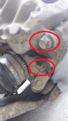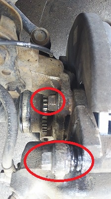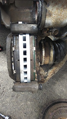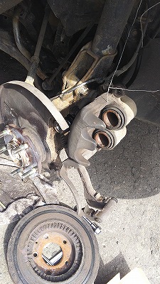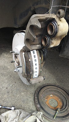 右側の作業の様子です。車種によってはパッドにあたるピストンを押し戻す時に、