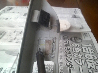 ![]() 樹脂の部分を外し、針金などに、コードを 巻き付けて通線しました。 |
