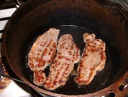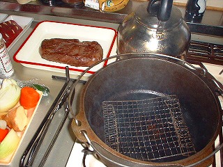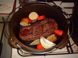 時間がなかったけど、どうしてもステーキが食べたくなりました。ただフライパンで焼くだけじゃ面白くない!で、DOでステーキっす。材料はスーパーで特売のサーロインステーキ肉3枚980円(爆)
