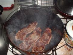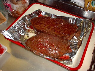 DOを軽く水洗いして油をひき余熱、、塩胡椒したステーキを片面約2分ずつ。ちょいと焼きすぎちゃったかな?(爆)