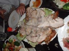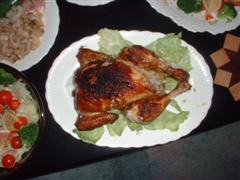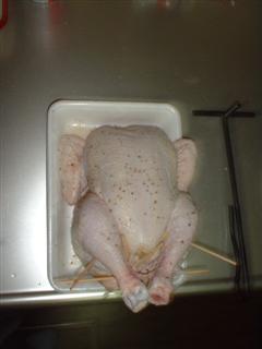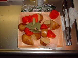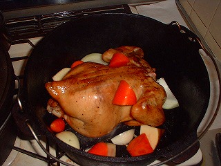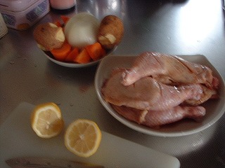 相変わらずの超簡単レシピっす。買ってきたチキンの腹に1個分のカットレモンとニンニク3切れを詰めて袋止め。あとは野菜と一緒にローストです。上火は又もバーナー登場(爆)約1時間半で完成でした。