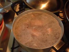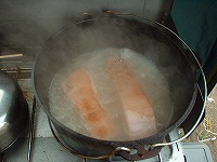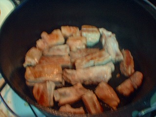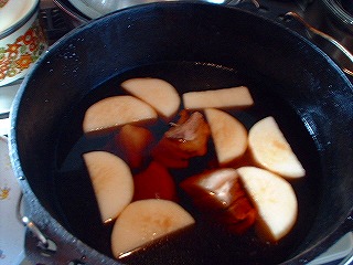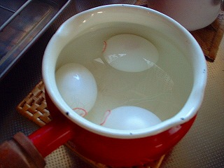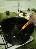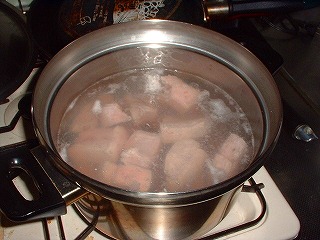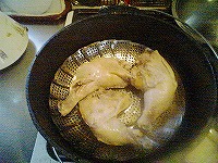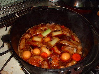 まぁ、これも煮込み系なんで簡単なんですが、まずはお米とぎから始めます(爆)とぎ汁で煮込むと柔らかくなるって噂の検証です♪後はとぎ汁と水と水で戻した日高昆布(笑)を豚肉が浸る位に入れてDOで加熱っす。約1時間位下茹でした後、一度中身を取り出し、DOを軽く洗い、水、焼酎、砂糖、醤油を適量入れ、予め作っておいた、ゆで卵と面取りした大根を入れ、1時間程度煮込みます。(最初は中火くらいで沸騰直前に超弱火に加減します。)寝せた方が美味しくなるらしいので、一晩放置しました。