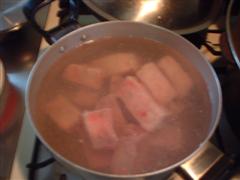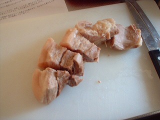 脂の少な目な豚バラ5人分を用意(余分な脂は、包丁でそぎ落としておきましょう)。まずはお湯を沸かして1時間程度、湯煎し灰汁を取ります。煮込みタレは醤油5・みりん1・酒1・塩を味見しながら多めに3〜4サジ・水5〜6。その後とろ火で1〜2時間。これで完成っす(笑)食べるときにはスライスした後、七輪か電気焼き肉器で炙って下さい。(炙るとメチャ美味しくなります。)