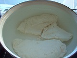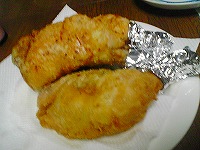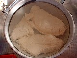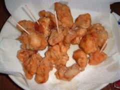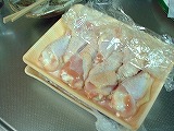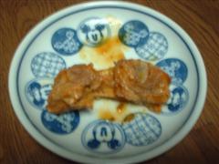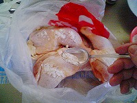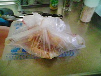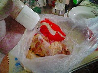 冷蔵庫深層部にて冷凍チキンを発見!(爆)ほいでチキンナゲットに挑戦してみました。カットした鶏肉を、ほとんどフライドチキンの調理法と同じくやってみました。胸肉だったのでザンギ(醤油漬け込み揚げ)にした方が正解だったと思われます。 |