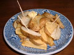 何気なく作ったフライドポテトです。油を深さ2センチ位入れて皮付きカットしたジャガイモを放り込むだけ(爆)バターをのせて熱々をどうぞ!