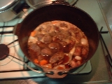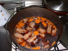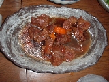 油をひいたDOで塩胡椒したすじ肉の表面を焼きます。(人参と玉ねぎも入れてみました)焦げ目がついたら炭酸水とコーラ、醤油(多め)、砂糖(多め)を入れ、フタをして1時間。途中40分位で味見。まぁまぁだけど、未だ味は薄く肉も固い。1時間後、ホクホクしてトロッとなったお肉の完成でした。オマケの人参が格別に美味しかったっす(笑)盛りつけ時にはキッチンバサミで一口大に切った方が食感が良いです。2キロ近くの量を、あっという間に食べちゃいました。(爆)