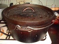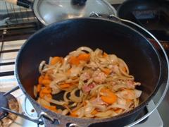 プレヒートしたDOに油をひき、上げておいた肉を放り込み両面を焼きます。軽く焦げ色が付いたら野菜などを投入し、コーラと醤油を入れます。僕は無精なんでニンニクは粉末ガーリック、生姜は練りチューブを使いました(笑)