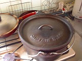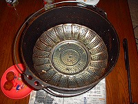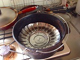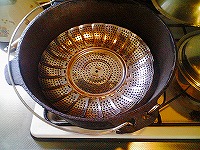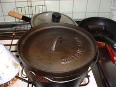 これは、チョイと失敗作の手羽ローストです(笑)焦げ付き防止の網をDO内に置き塩胡椒した手羽先を放り込むだけです。キツネ色になる頃合いを見て完成っす。何故美味しく無かったのかは不明です(爆) |