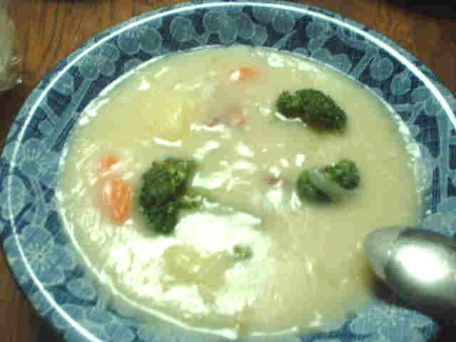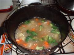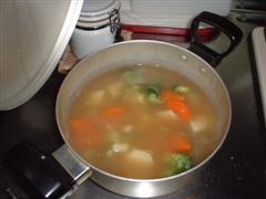 早速、DOにお湯を沸かし、皮を剥き大きめにカットしたジャガイモ、人参を固形コンソメ5個と一緒に放り込み約15分。人参を味見するとホクホクで良い感じ。さらにブロッコリーを放り込み約5分。