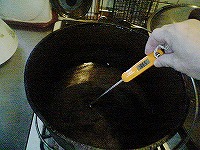 油温を確認し、お肉をDOに投入し蓋をして片面約4分で裏返し更に5分程度、表面をカリッとするため、最後は油を180℃位まで加熱しお肉の中から肉汁が破裂する位になったら取り出します。