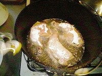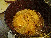 手順は簡単です。お肉をビニール袋に入れて香辛料入りの塩胡椒で味付けし、暫く寝かせてからDOの油温度を150度位でフタをして約10分間揚げます。フタをハズして170度位で色つけ&表面カリカリ仕上げして完成です。