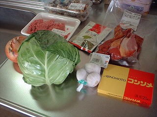近所のスーパーへ仕込みに出かけ、キャベツ、玉ねぎ、コンソメ、ニンニク、合挽肉、ローリエの葉をGet。