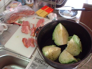 メニューを思案した結果、NET仲間のSAMさんのレシピを思い出し、丸ごとキャベツ(あっ、SAMさんトコではちゃんとした名前が付いてます)に挑戦です。