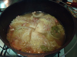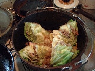 あとはSAMさんのレシピにならって、玉ねぎみじん切りを炒め、挽肉を炒め、キャベツを四つ切りし、葉の合間にベーコンと先程炒めた挽肉&玉ねぎを盛り込み、DOに水を半分位いれて強火で加熱。湯気がでたら弱火にして煮込み開始。途中、味付けにコンソメブロックを投入。コンソメは今回は大量だったので12個位使いました。1時間程でキャベツがばらけてきたので完成!