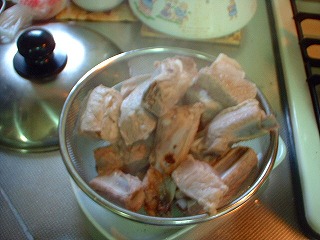 近所で特売のスペアリブをGet!で、お湯で脂抜きしたあと、炭酸水1本、ミートソース3缶、ニンニク少々、塩少々、で煮込み開始。途中の味見で砂糖と醤油を足しました。一応の煮込み時間は1時間を目安に。