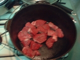 事前にお肉に切れ目を入れて小さく切ったニンニクを差込味を馴染ませます(完成後に、この効果が威力を発揮します)プレヒートしたDOにお肉を入れ手早く外側を焼き、味を内部に閉じ込めます。