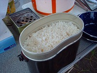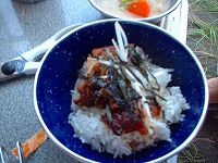 飯ごうで御飯を炊き(飯ごうに、といだ米をいれて指の第一関節程度の水を足し、ツーバーナーの上で30分程度の中火で簡単に炊けます。少し蒸らして完成)。その上にチャーシューをばらけさせて、30分程度水にさらした白髪ネギ(苦み取りっす)と海苔をまぶして完成です。