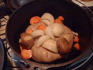 DOに網を引きお肉と野菜を入れ蓋をしてロースト開始です。一応キッチンタイマーを30分にセットしましたが、レシピに書いてあるとおり、5分きざみ位で金串を刺し、5秒くらい刺したら引き抜き先が温かったOKっていう方法がベストでした。確かに時間でやると中まで火が通ってしまいます。約15〜20分で完成でした。