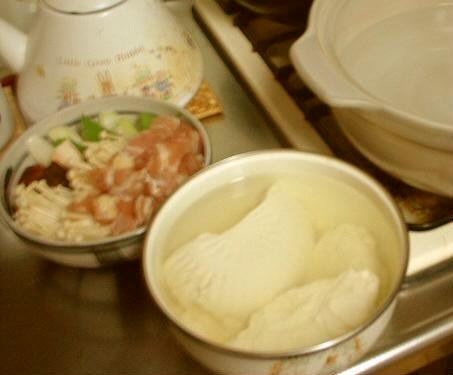 湯豆腐の材料は、ネギ、椎茸、エノキダケ、鶏もも肉、きしめんっす(笑) |