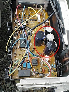 | 07年の夏キャンの最中に長女から緊急連絡ありまして、家のエアコンが冷えないって事で・・・・。帰宅後に調査したらリモコンのスイッチを入れた瞬間は室外機のファンも回り出すのですが、すぐに停止し室内機からは、ぬる〜い風が(爆)除湿で動作させてみると、冷房よりは長時間動作するけど、やはり途中でNGに・・・。 早速、室外機の故障原因調査っす。テストの為にファンやコンプレッサーなどに基盤上で直接電圧加えると、ちゃんと動作します。って事は電源基板が怪しい。で、早速メーカーのフ○イに問い合わせると基板だけの販売は行ってない。メーカー指定のサービス代行店が訪問して修理するしか対処方法はなく費用は約4万円程度との回答。ヤマ○電器の現品特価品を3万円で購入したのが3年前。(゚-゚;)ウーン・・・安物買いは高くつくな〜〜〜〜。納得いかない!!!(爆) 結局、メーカー修理は断念し自前で修理する事に。再度、基板を点検すると・・・・(._.?) ン? 電源回路用の電解コンデンサーが2箇所ほど異常に膨張してます。これだ!!!って事で、早速市内のパーツ屋さんへ走りコンデンサーを探します。が、多分、中国製であろう、この回路のコンデンサーは売っておらず、ワンサイズ上の容量と定格電圧のコンデンサーを取り寄せてゲット(4個で約4、000円位) 室外機から基板を外し室内にてコンデンサーの交換作業。要した時間は20分程度。ハンダ後に基板を戻し、ついでにファン回りも軽くブローして清掃。 試運転したらバッチリOK!!!(⌒▽⌒)アハハ! 治っちゃいましたわ! ラッキー\(^^\)(/^^)/チャチャチャ 修理してから半年後のレポUPですが、備忘録としてページを作成しました。ちなみにその後は快調に動作してます。 レポを見て同様の作業する場合は自己責任でお願いしますね。 <(._.?) ン? そんな人はいない?!!!(爆)(爆)(爆) |