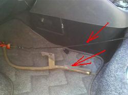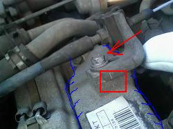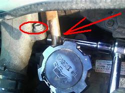 ![]() サーモスタットハウジングを外す ためにスロットルワイヤーのステーに マーキングしておきます。 |