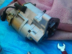 ![]() 外したセルモーター。 このギヤが瞬間的に飛びだし、 エンジンのフライホイール部にかかり シャフトを回し始動します。 |