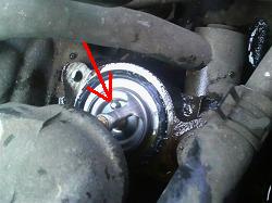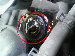 ![]() 古いサーモスタット 予めフロントのラジエター部分で 2リットル程度のクーラントを 抜いておくとハウジングを外しても あまり漏れません。 |